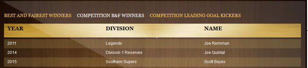 Year Team Coach Best & Fairest Leading Goal kicker Best Clubman